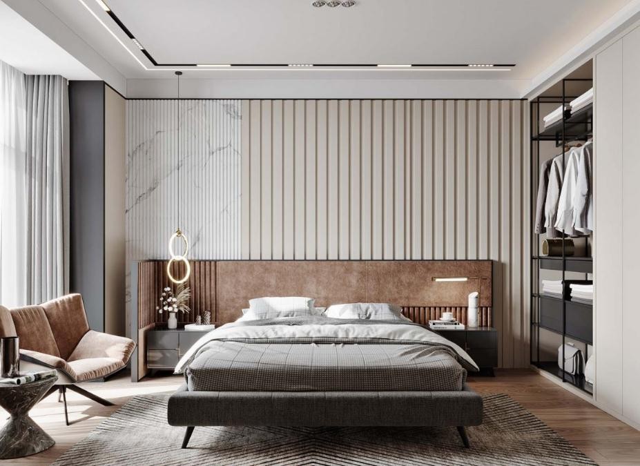 硬包岩板做床头背景墙
