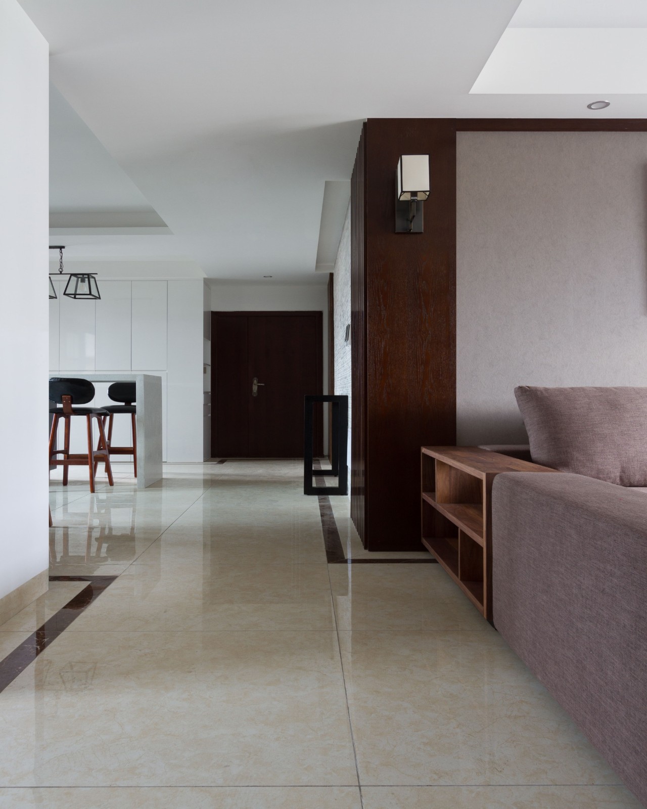 哑光油灰的烤漆柜门,房门、复合木地板、仿石材的灰色砖