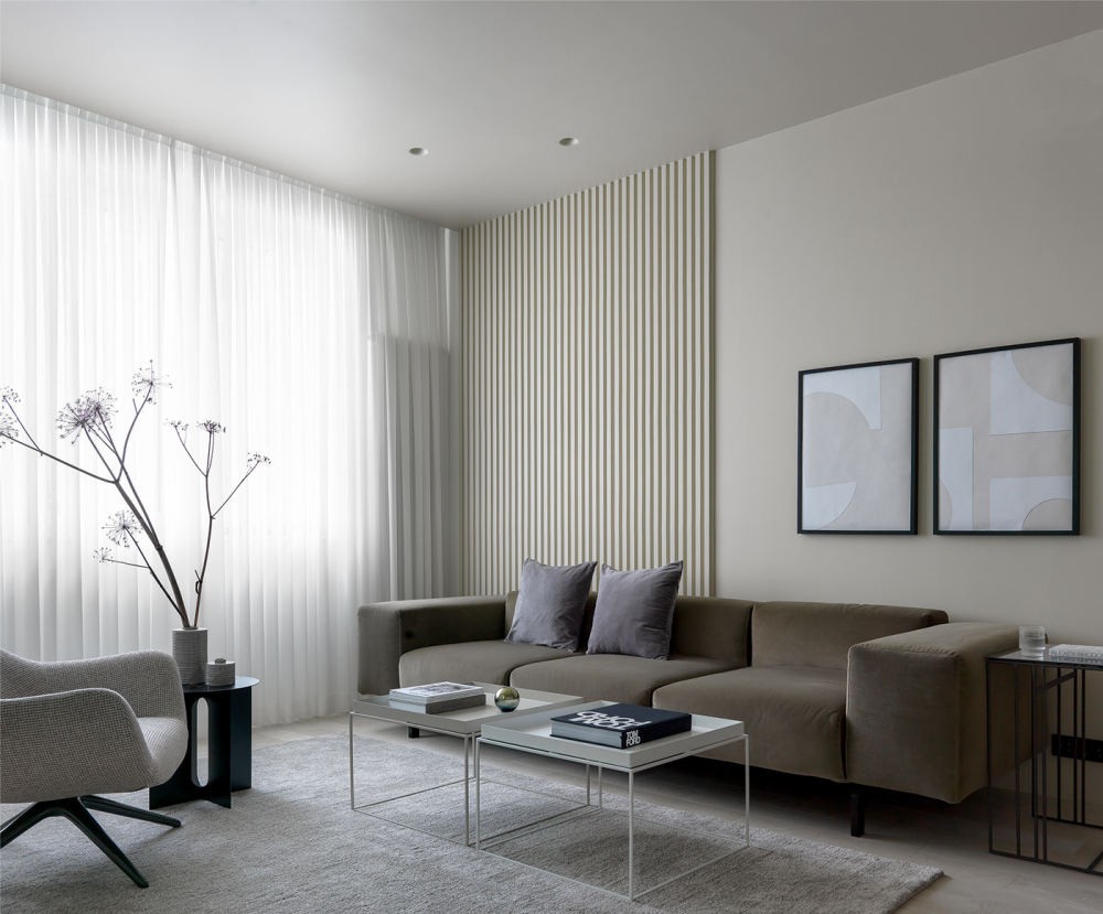 以大面落地窗引景入室,低台度的家具,让窗外景观尽入眼帘。