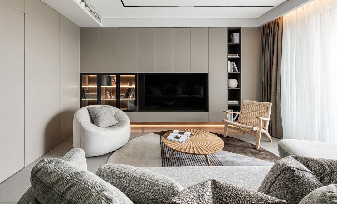 整面电视背景墙设置了充裕的收纳空间,电视顺势内嵌于柜体中。透明的黑色玻璃柜在视觉上更显通透,消除了大面积柜体带来的压迫感,柔和的灯带增强了空间层次,让室内弥漫着生活的温暖气息。
