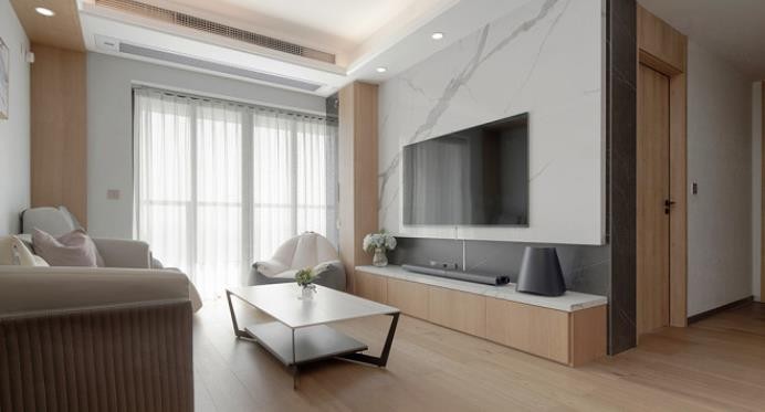 客厅整体以木质和白色调为主, 灰色与藕色混合的软装搭配让空间的明亮度保持让人舒适的状态。 电视背景墙采用一体式的大理石纹瓷砖, 悬挂式液晶电视镶嵌在内并和背景墙维持在同一个平面上。 沙发和电视机顶部采用暖黄调的筒灯作为补充光源。 客厅与外部阳台相连接, 为了遮阳却又不希望失去自然采光, 设计师特意选用了轻透的白纱窗帘。