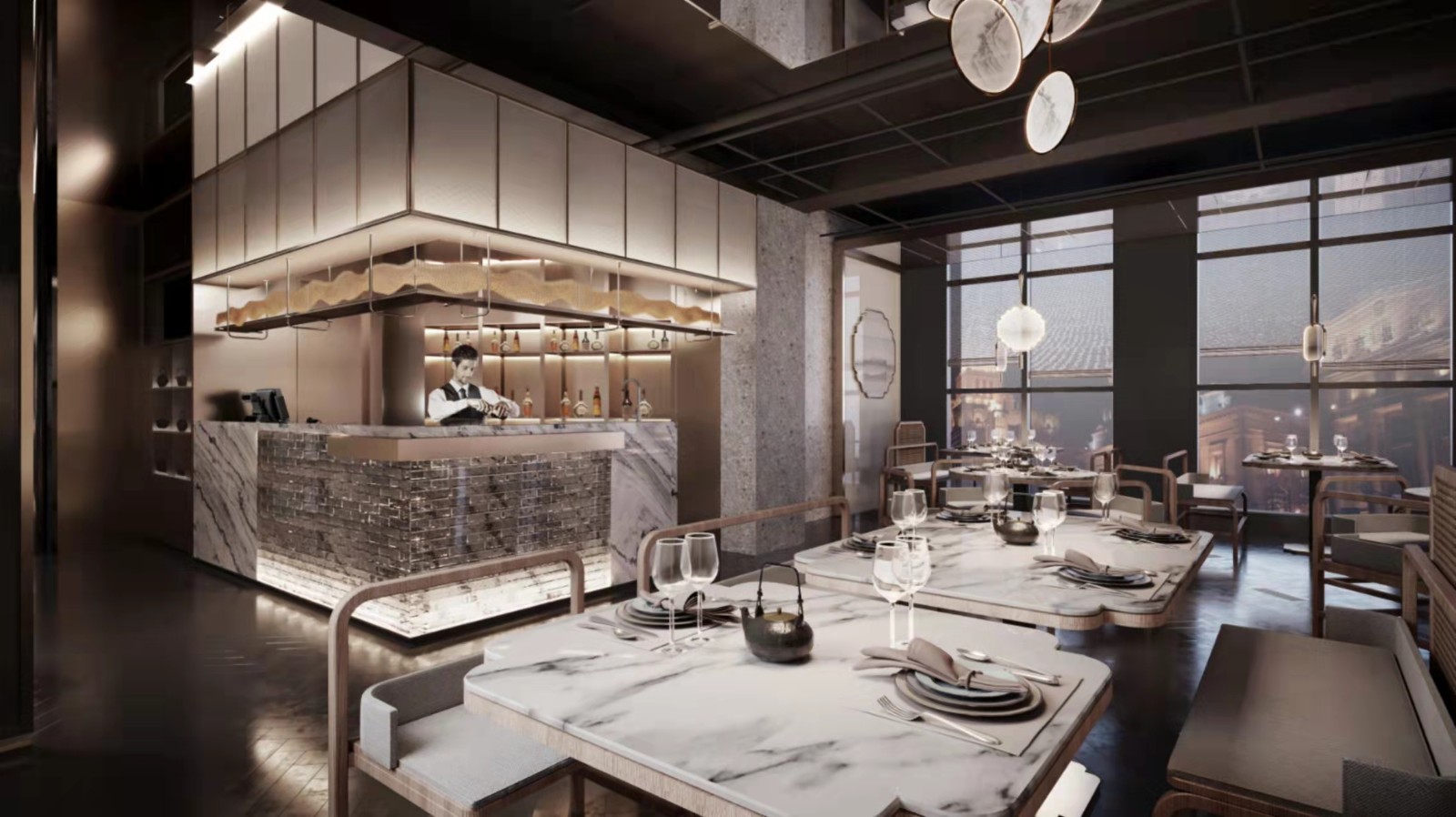 吧台、冷热菜厨房、备餐区、甜品区、洗碗间、大厅、包厢等