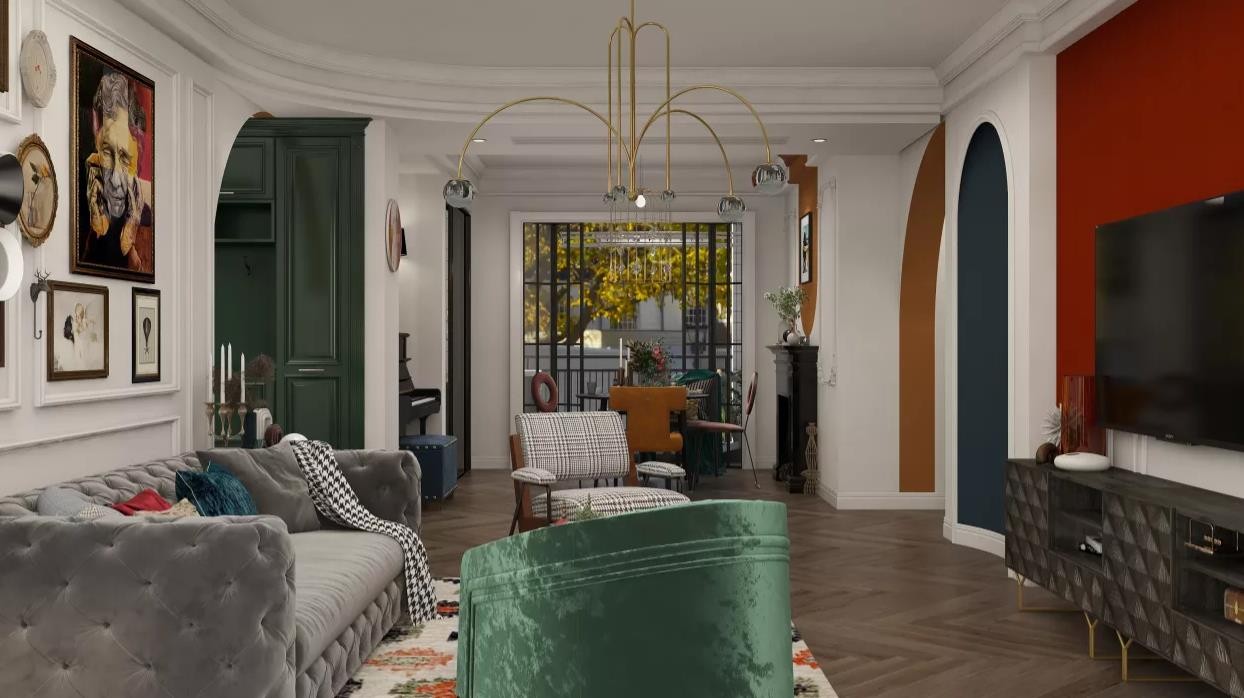 奠定了家的朴质,而造型上趋于复古,再搭配美式古典风的家具,足够明艳大气,赋予空间精致。