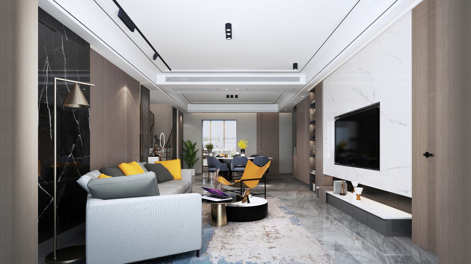 设计师在顶面处理上,使用了两层关系的金属线条,***层将整个空间拉通,体现了空间的延续和整体性,第二层线条处理使客餐厅空间又相对独立,使空间出现更多的层次关系与遐想的可能;