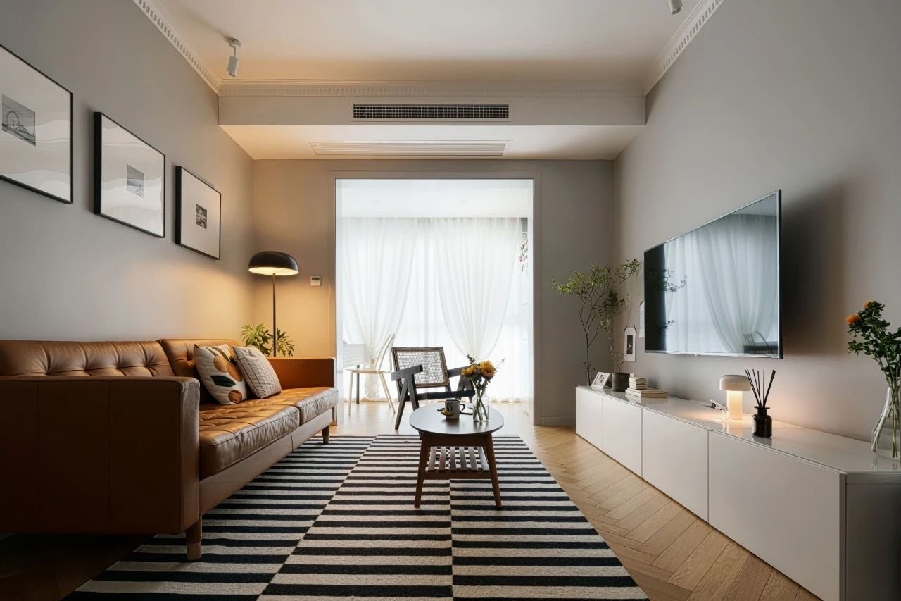 斯德哥尔摩系列黑白条纹地毯,让客厅立显精神。兰德克纳蜜蜡色皮质沙发,为客厅增添了几分温度。