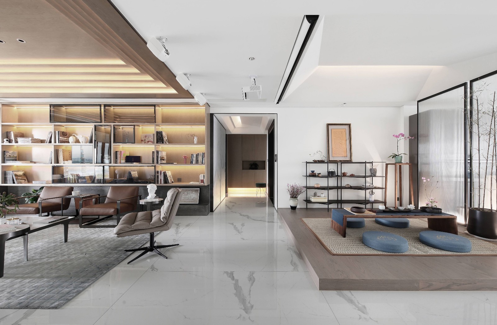 客厅为主轴,为二进:“空间的灵魂”。 整面书架结构作为客厅的中堂,当中呈现出“正”字背景。
