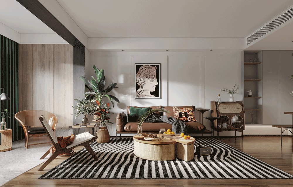 色系相依的娱乐空间,纹理清晰的咖色地板,深沉内敛的皮质沙发与淡雅宁静的茶几间相得益彰,黑白的斑马条纹地毯更是加深了视觉重点。