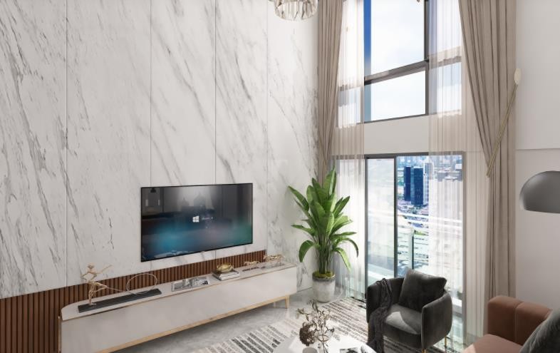 白色加金属边框的电视柜体,给人焕然一新的感觉,大理石墙面呈现的纹路让空间层次更加丰富