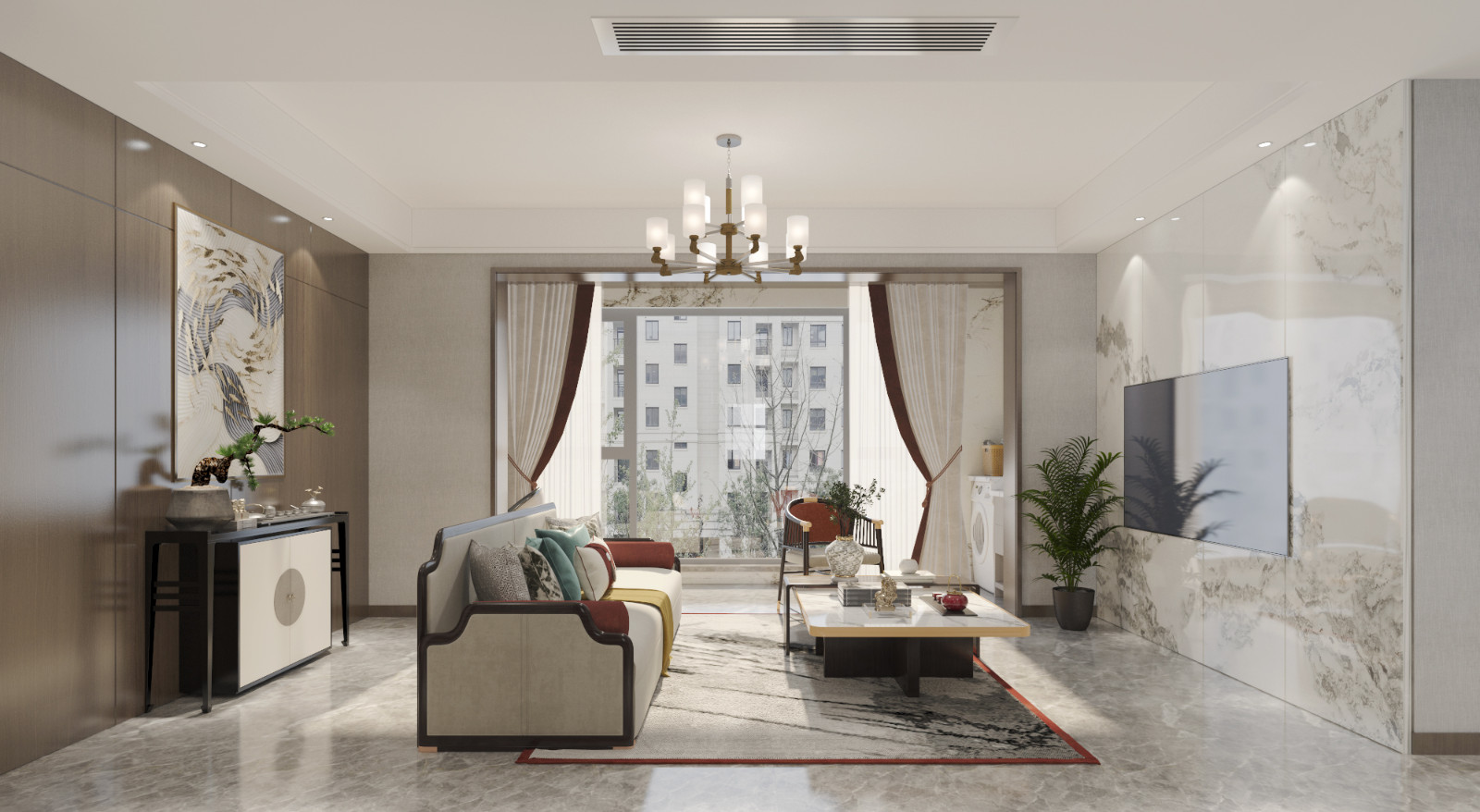 简约东方风格配合上简约素雅的岩板面,纯白石座, 电视背景墙在有意无意的现代极简与传统中式的对碰中, 运用了不同比例的调和, 灵动精致,富有层次感;