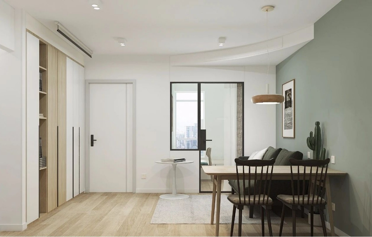 客厅借用厨房卧室采光,次卧做了玻璃门窗,偶尔有人住的时候,可以把窗帘拉上,保证隐私的同时,也不影响采光。