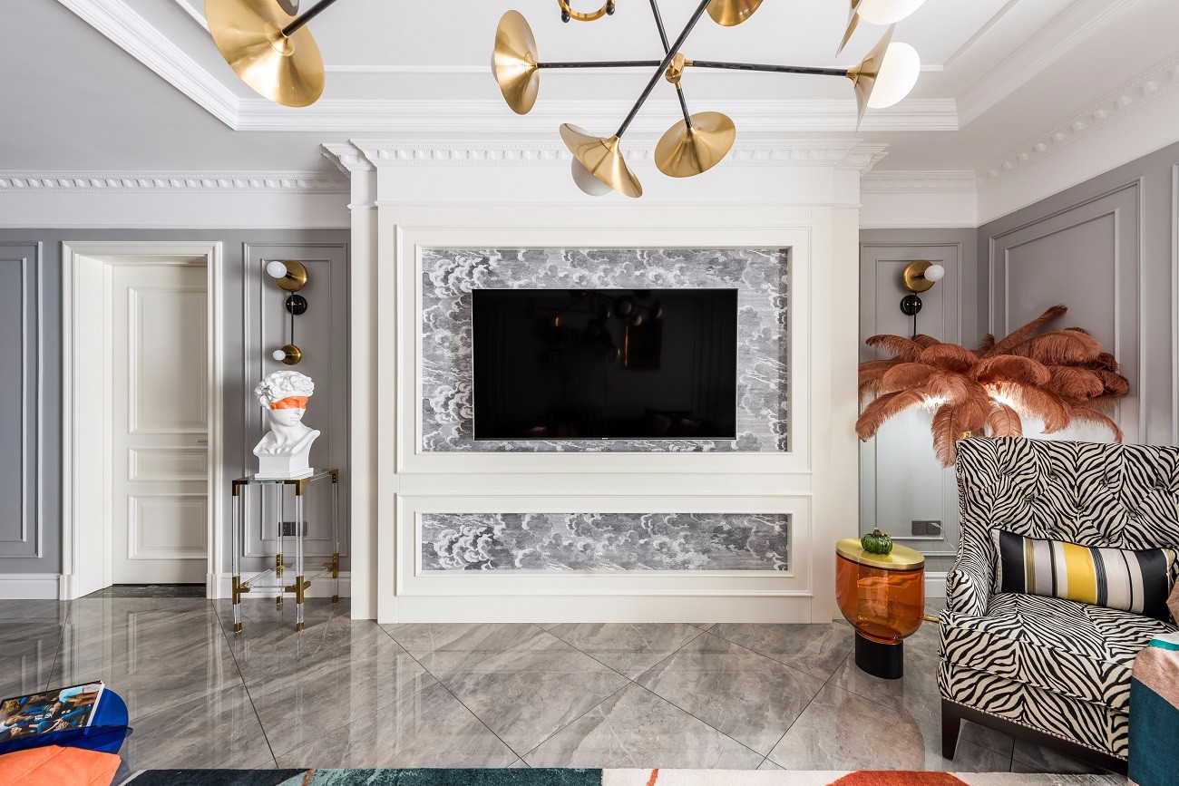 客厅设计中摒弃电视柜的传统印象, 取而代之的是, 形似壁炉的造型墙面, 采取跌级处理之后更显立体生动。