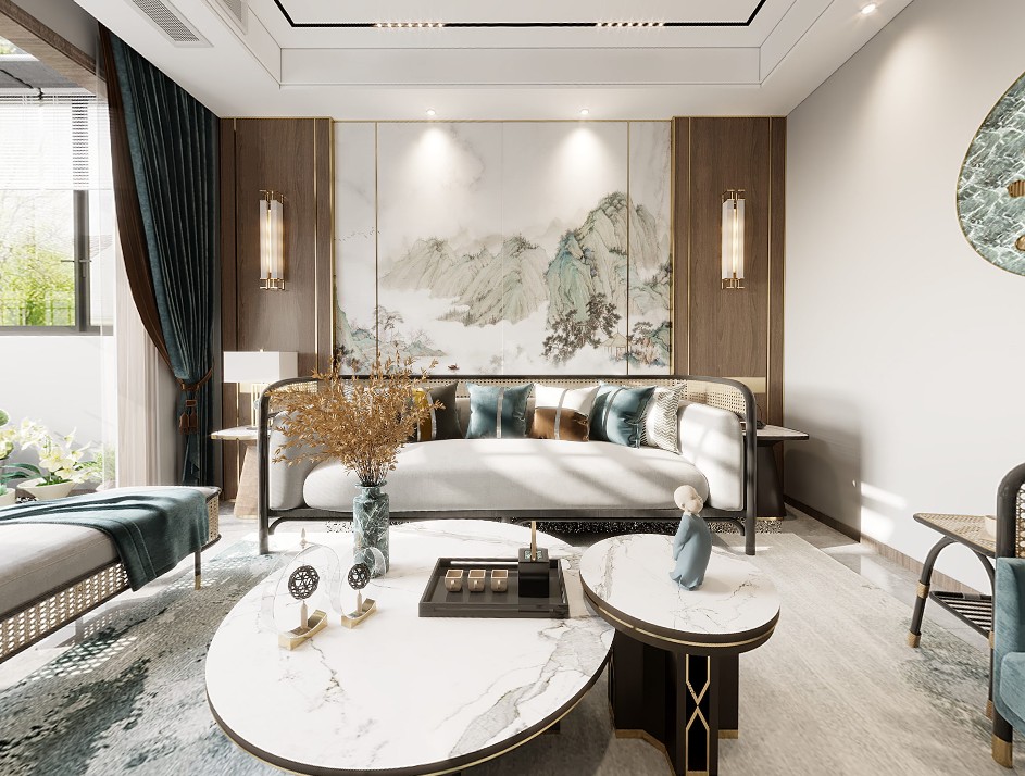 客厅电视背景整体化处理,尽量避免电视成为客厅的中心,适当的加入石材的花色,让空间更显质感。