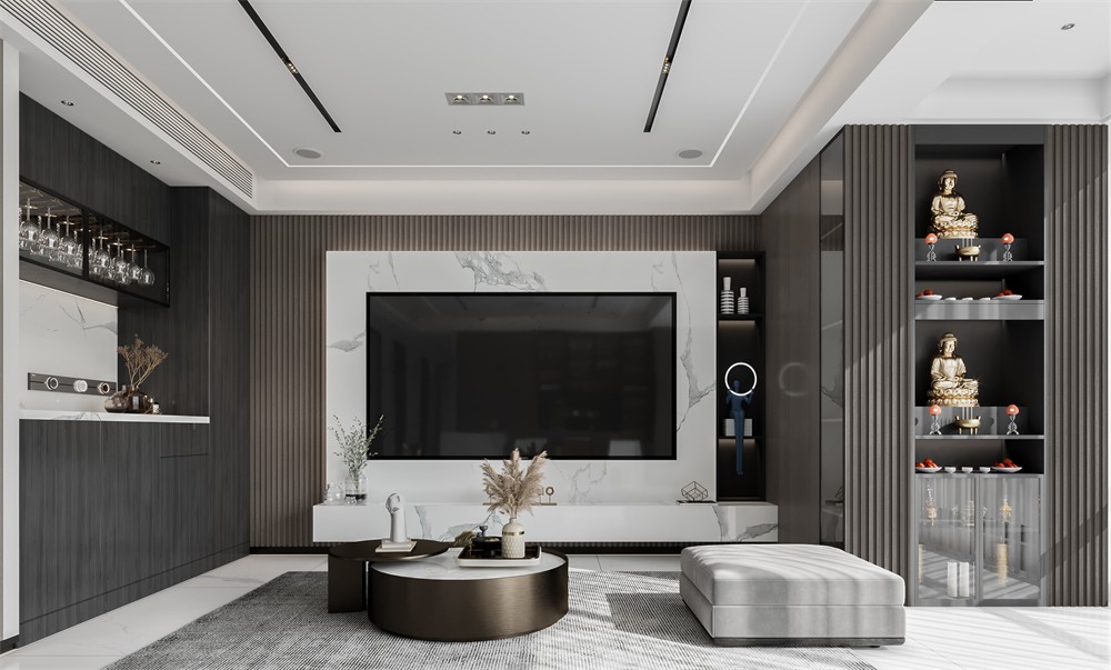 客餐厅的设计比较多,从隐秘工程到软装的灯光的搭配都非常考究,首先是客餐厅做的是无主灯的一个设计,结合餐厅的岛台式餐桌,西厨的吧台,电视背景,墙面装饰等等,无一不突出细节所在。