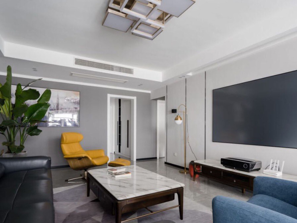 客厅做了简单的吊顶,没有复杂的设计,电视背景墙采大白墙搭配钛金条的形式,简约又有质感