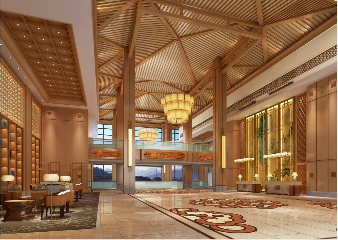 酒店大堂定位于休闲度假酒店, 同时满足高档酒各种功能配套。