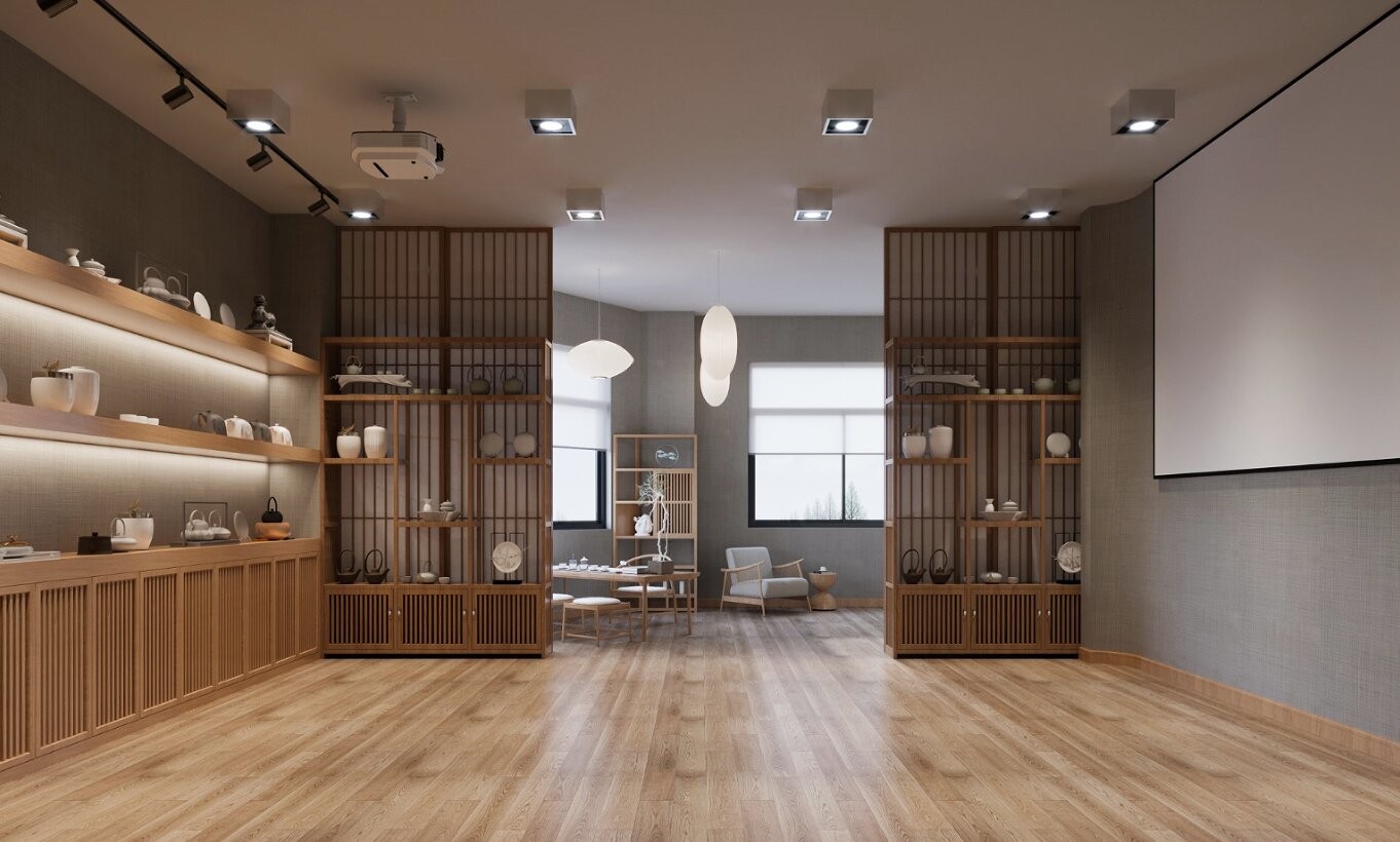 地面弧线地板砖分割区域,三面围合柜体展示茶具的同时增加区域特性