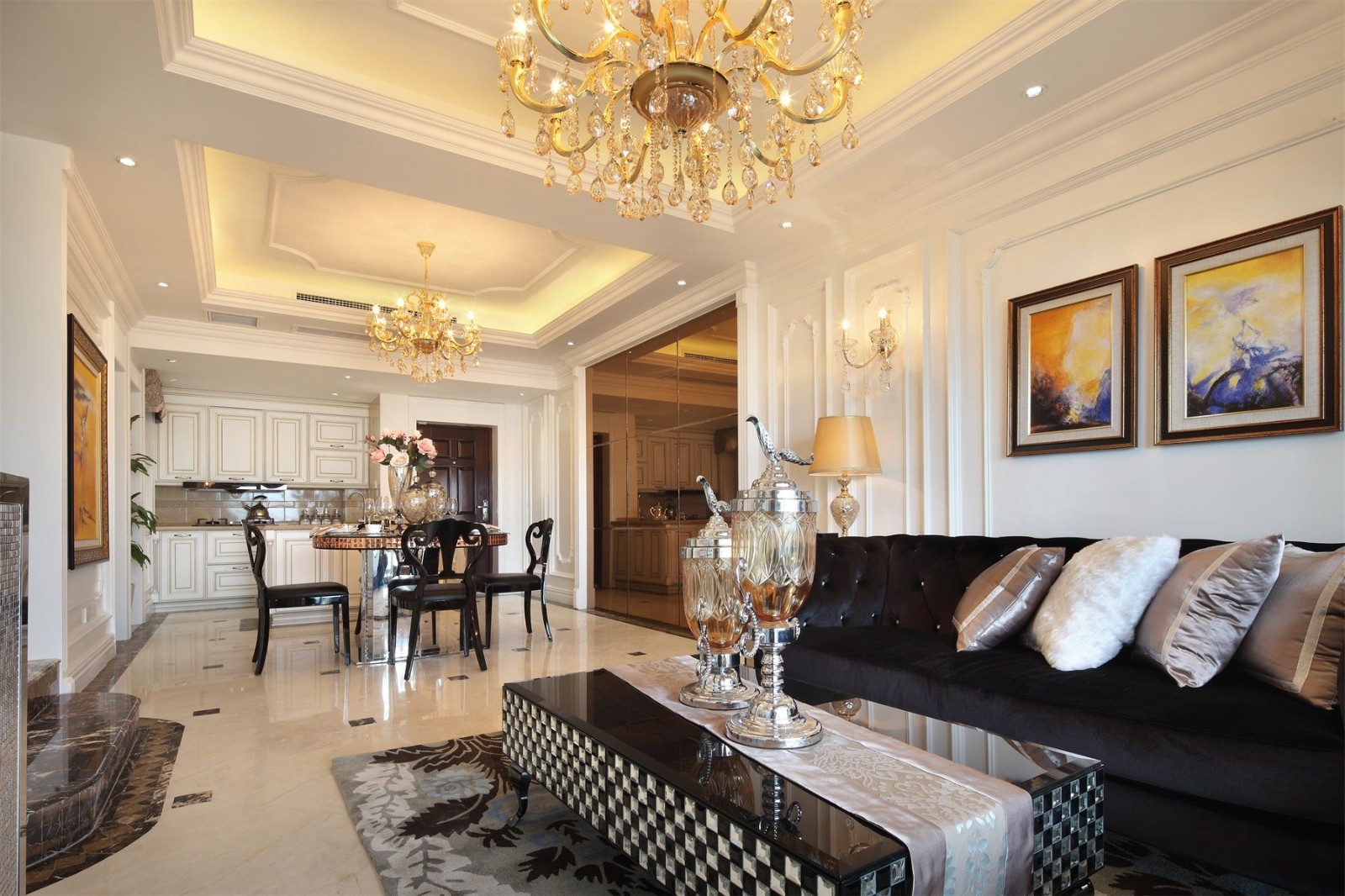 【客厅】布局上突出轴线的对称,恢宏的气势,豪华舒适的居住空间;贵族风格,高贵典雅;细节处理上运用了法式廊柱、雕花、线条,制作工艺精细考究;点缀在自然中,崇尚冲突之美。