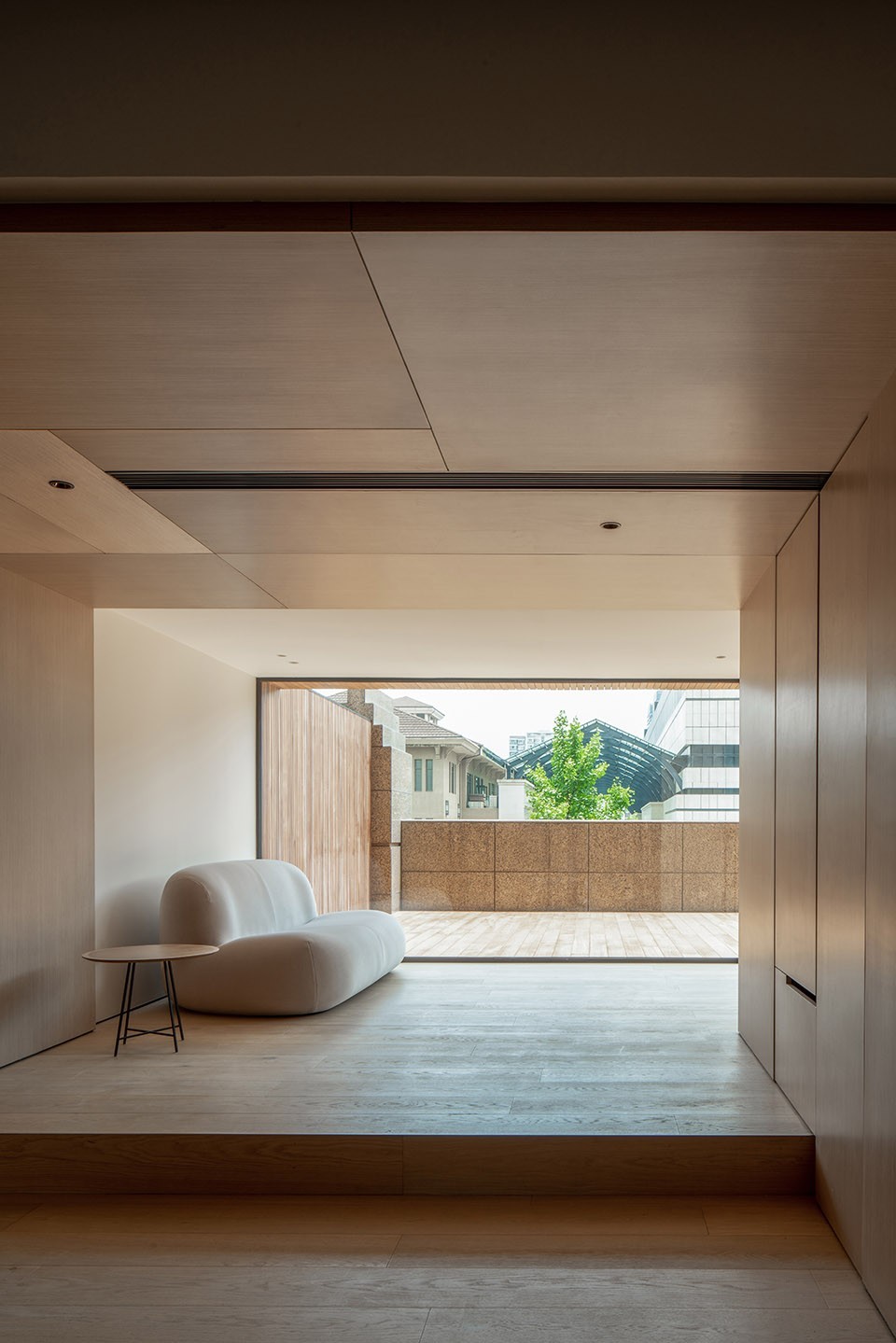 利用原本室内外的落差为起居室设置两级台阶,为进入起居室营造一种“拾阶而上”的仪式感。沙发侧旁的木盒子内藏有大量的储物空间,同时墙根也采用脱缝的做法,用内凹代替外凸,保持线条的一致性。