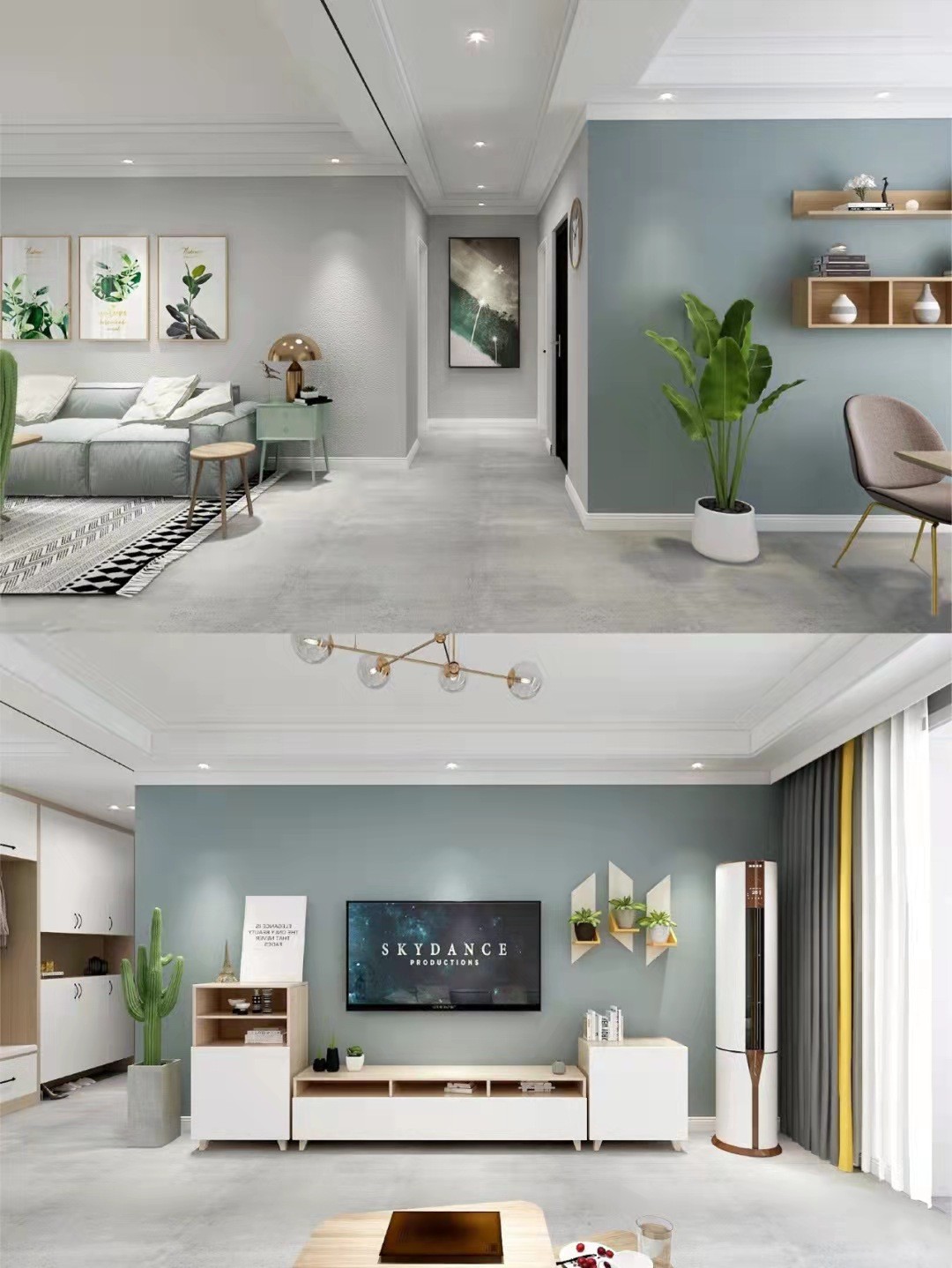 地面选用灰色地砖,灰色和蓝色相互对比,整体协调。