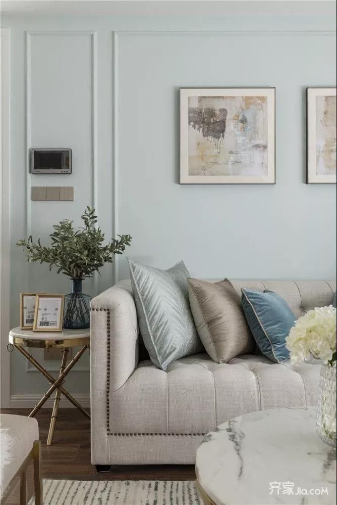 整个空间以清爽明朗为主,选用浅松石色作为墙面,海港蓝运用在沙发和窗帘上,同色系冷调搭配,空间更加平和