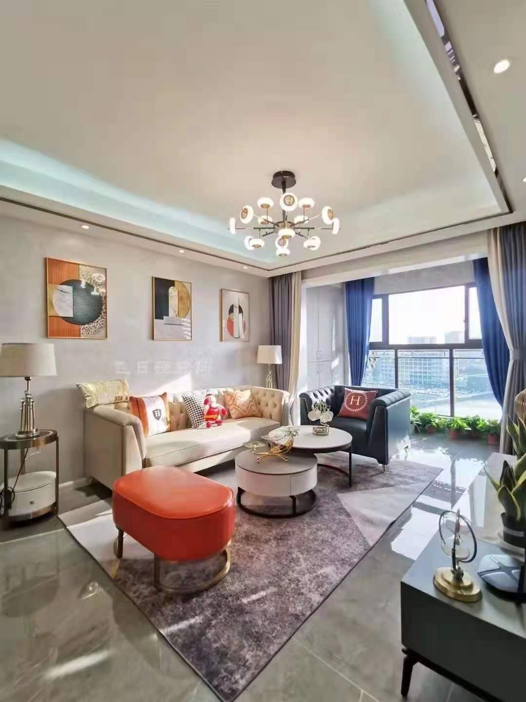客厅皮质轻奢沙发,跳色矮凳,