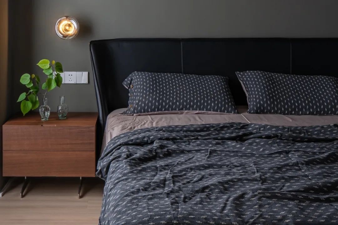 皮革和实木体现生活的质感,深色墙漆,金属构件点缀其间,搭配原木的地板,营造沉稳大气的睡眠环境