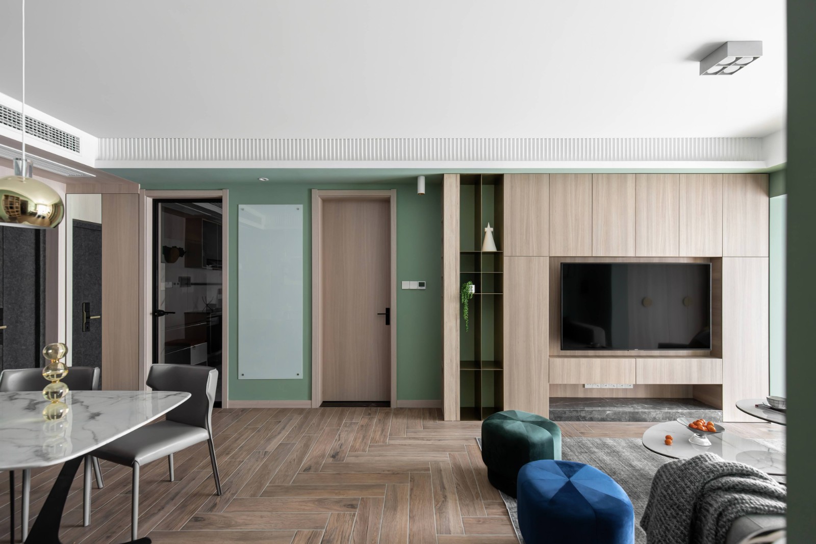 公共空间铺设人字拼地板砖,跳跃的蓝色餐边柜,颜值与实用兼具。