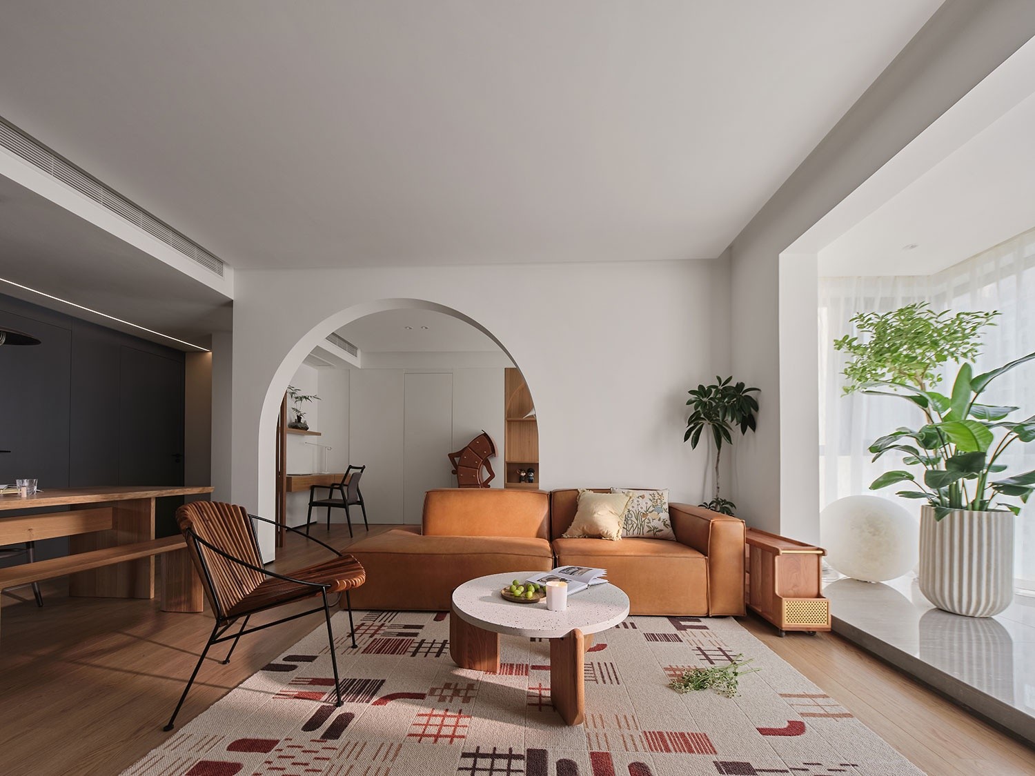 在小斗柜的叉腰守护下,素白的隐形门后是我们想表达柔和轻快的主卧,控制收纳空间,让居住者更容易卸下“包袱”的憩所则是主线,床对面的拱形极简式收纳与活动区的拱形置物柜隔墙相印,不会为了实用性去挤压睡眠空间,尽量放空才是放松时刻的完美填充项。