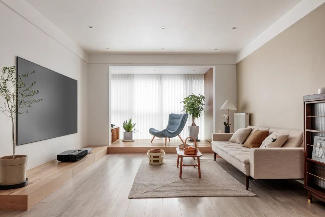 地台在电视墙采用硬碰的收口方式,通往阳台经常踩踏的区域考虑地板同色的阳角收口条,从细节上去满足视觉整体统一。