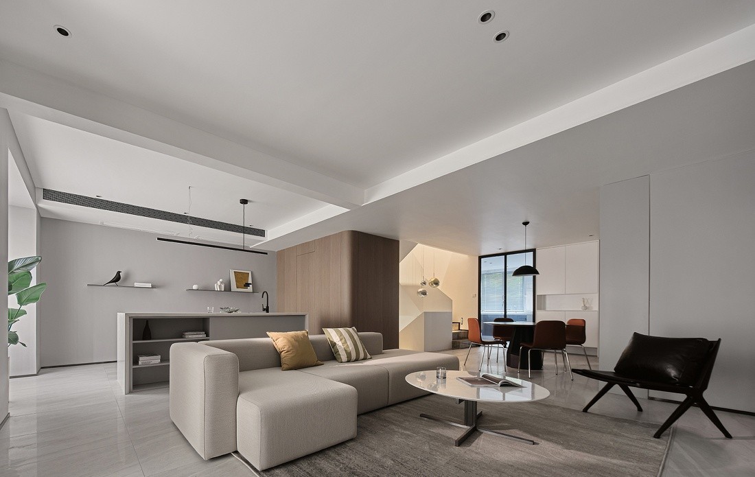 在灰色基调中客厅功能于视线中敞开,拥有两面采光窗口又连通自家院落,格外适宜承载综合的客厅功能。面积足够,通透明亮,这些组合起来的每一点都显得尤为重要。
