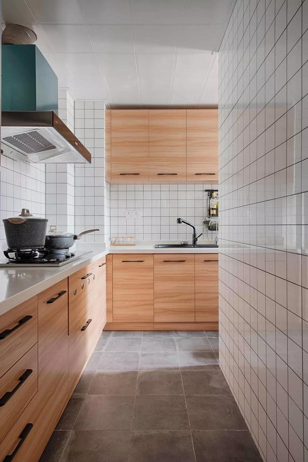 厨房内部是个L形的不规则空间,橱柜也沿着墙面来布置,地面铺贴灰色的哑光砖,搭配木色的橱柜和白色的墙砖,看起来轻松而又舒适。