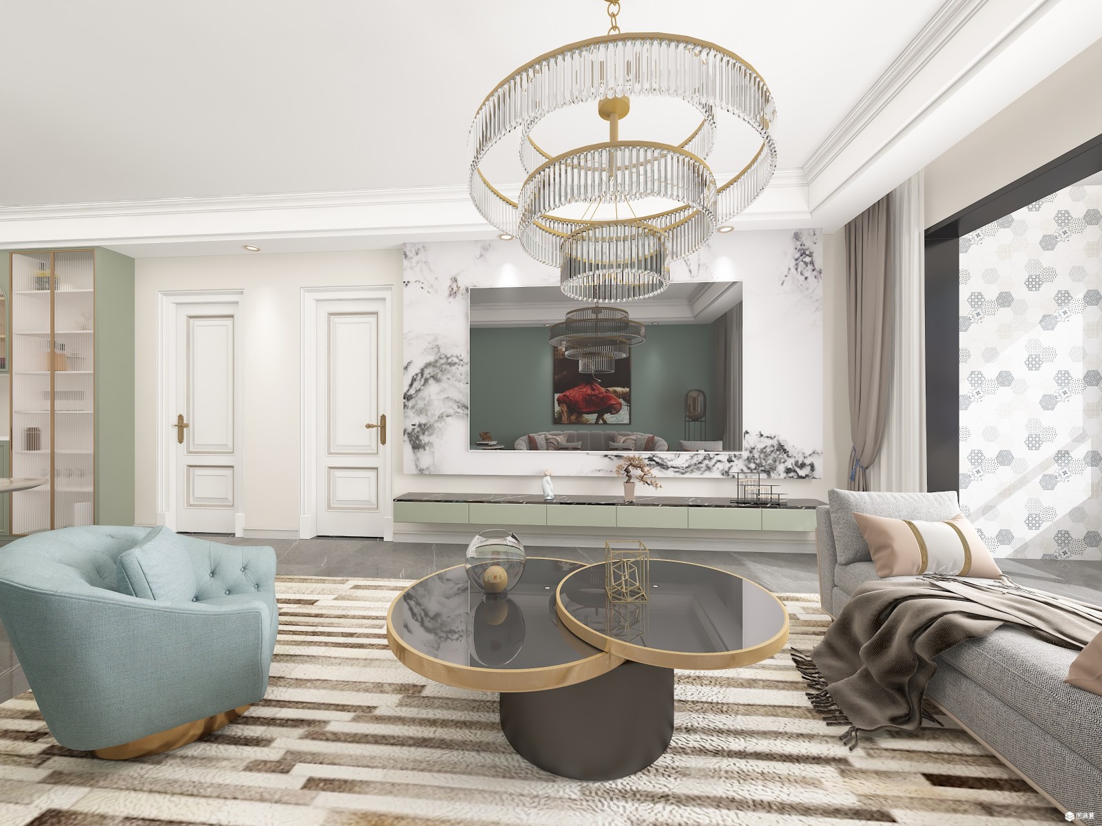 白色大理石背景墙与绿色悬空电视柜相结合