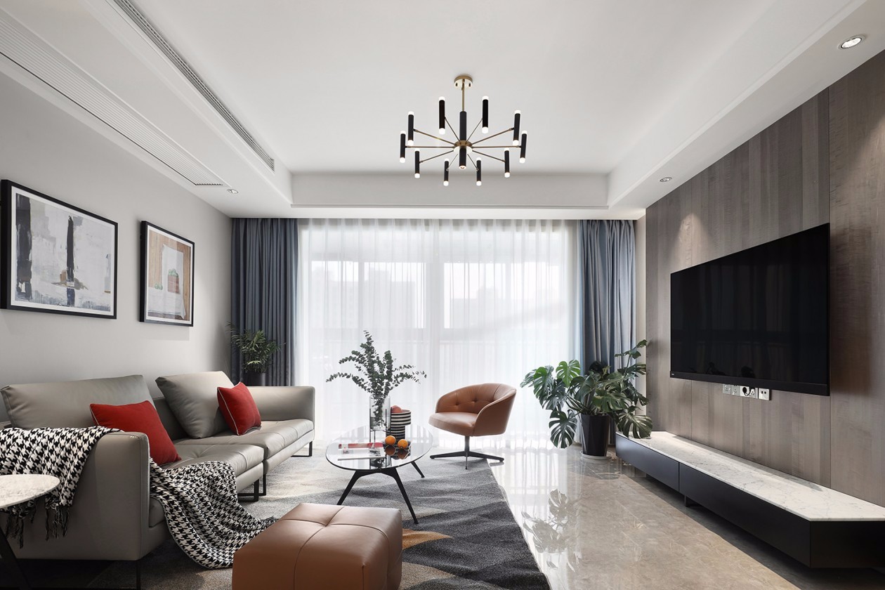 棕灰色主沙发配爱马仕橙的单椅,格纹地毯搭配时尚轮回经典之一黑白千鸟格的色彩搭配,主植物用了盆栽的龟背竹来点睛,整个空间浪漫又不失优雅