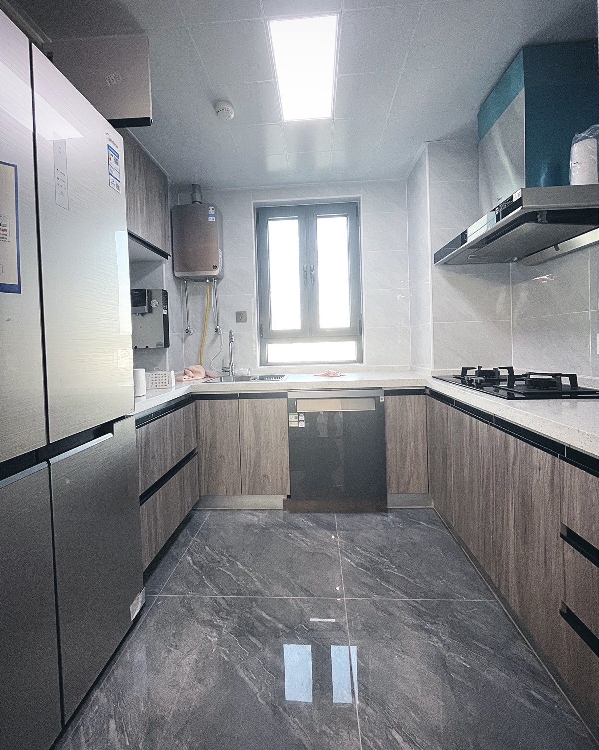 厨房浅色墙面 深色木纹柜门 时尚感增强