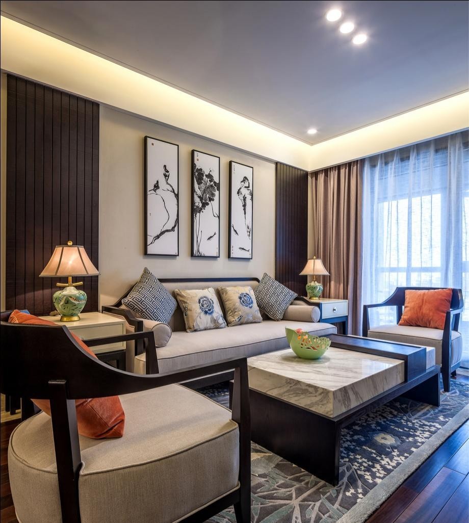 深胡桃木色装墙板和家具,地面选用天然黄洞石和胡桃木色地板的完美结合的设计,在空间视觉方面,有着聚焦和装饰的效果。