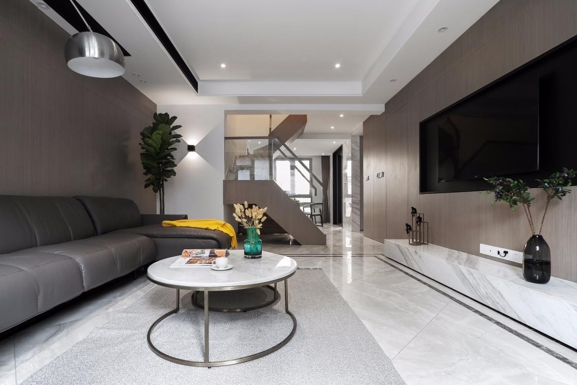 电视背景墙颜色和沙发背景墙颜色一致,体现现代感