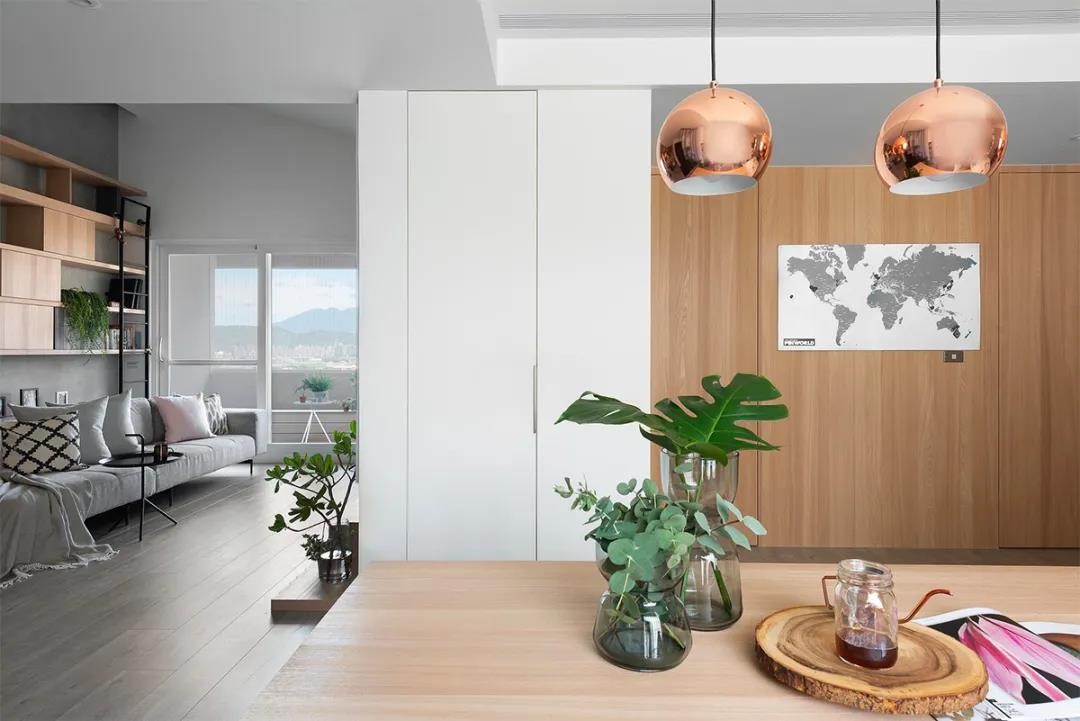 无主灯设计搭配白色及原木色,让空间极为开敞。