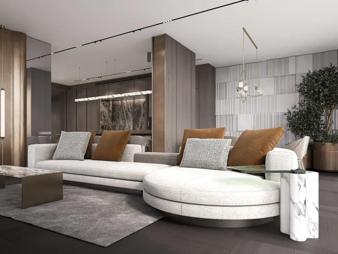 客厅是整个房子***的社交区域,通过波浪形面板覆盖的墙体,有效的增加了空间的质感。沙发配上几台,能够让人舒适的透过落地窗,欣赏美景