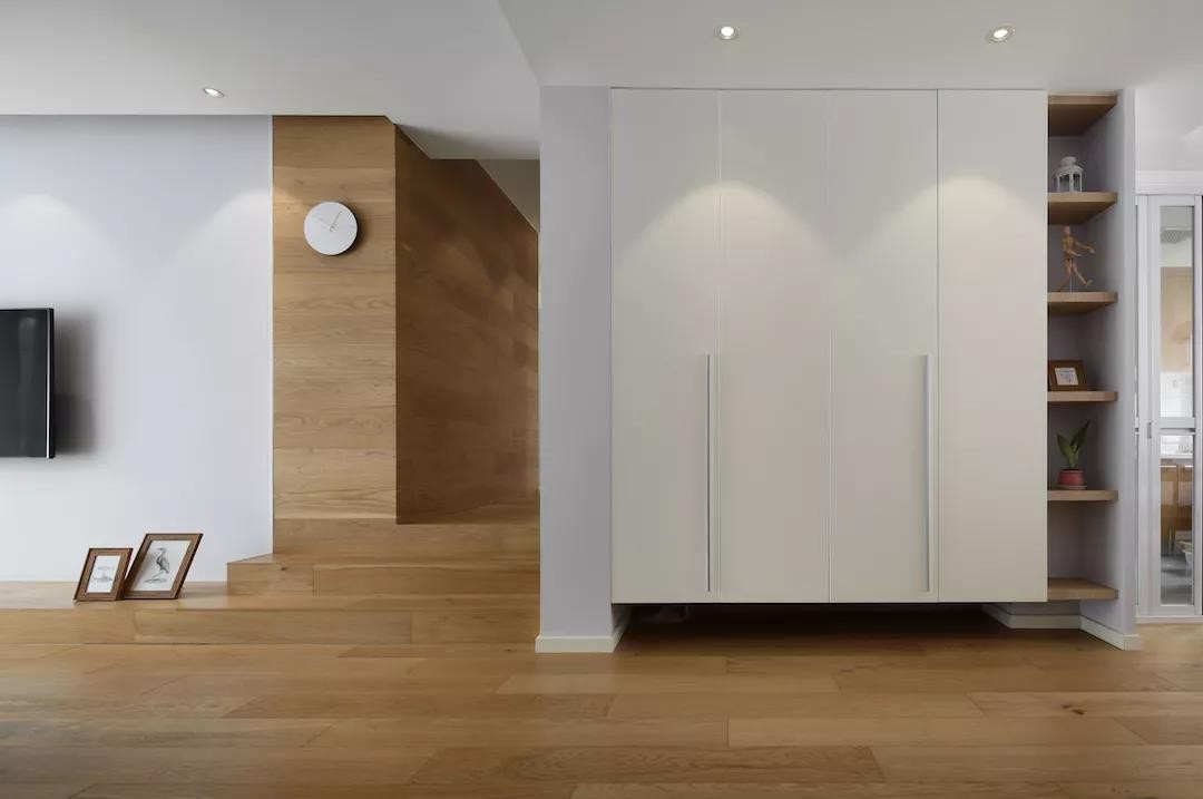 在木质感包围的情况下,玄关以白色鞋柜,底部留空方面存放常换的鞋子,结合顶上的筒灯照射,一开门就看到一个实用简洁的温馨画面。