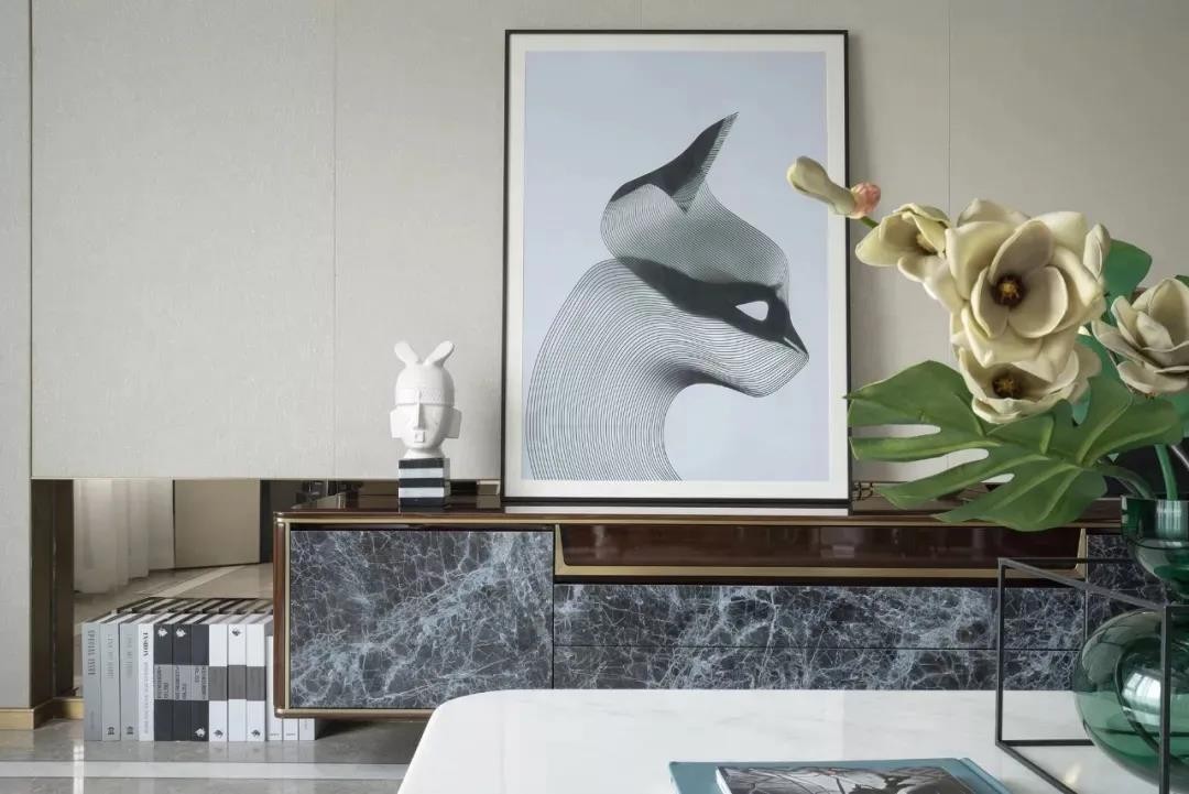 整个客厅现代优雅的空间,沙发墙以灰色硬包为背景,挂上蓝白灰色的意境装饰画,结合茶几上端庄精致的花瓶摆饰,整个空间都显得格外的儒雅端庄而***。