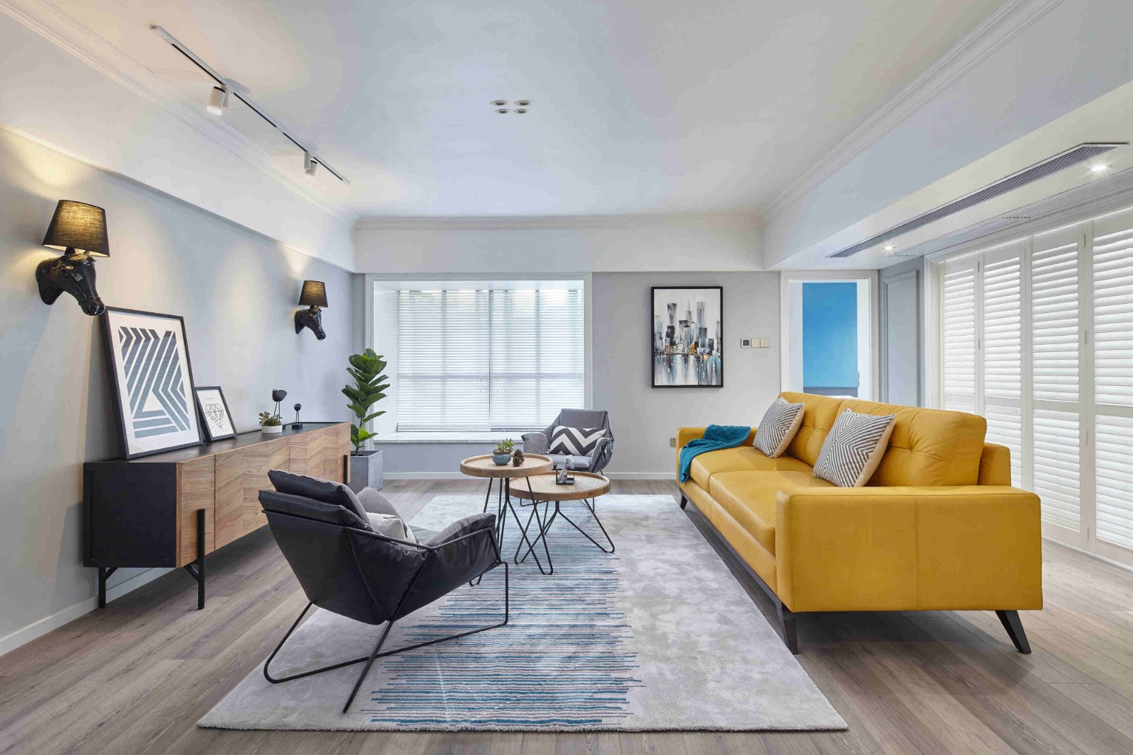 客厅中有黄色的沙发,色彩明确,有温度。客厅中有地毯,精致的壁画和装饰品。