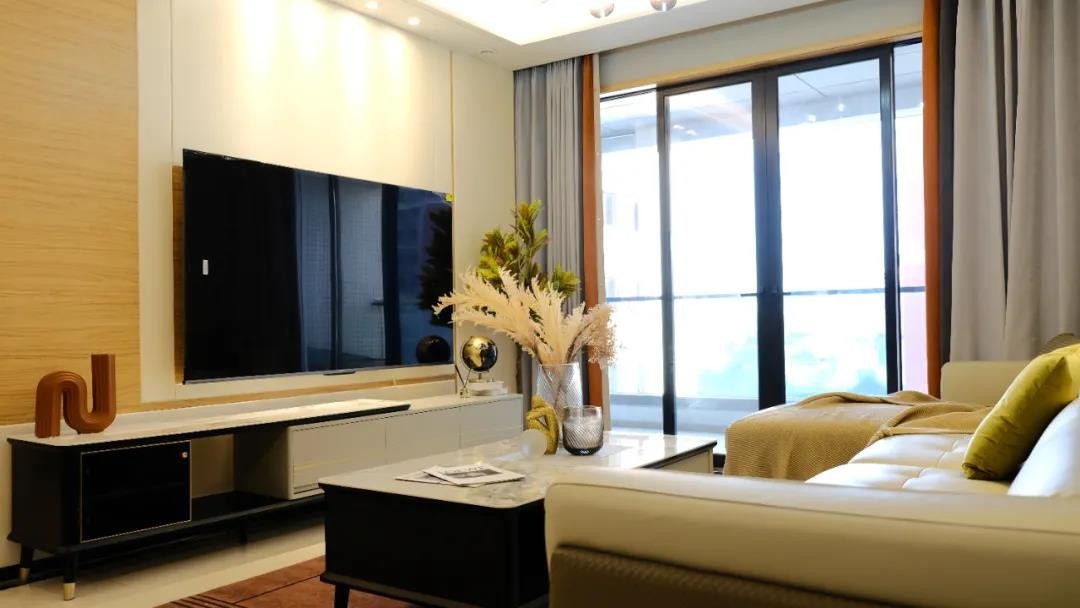 客厅是整个家里轻奢元素最浓厚的空间。 白色大理石地板低调衬托,米色皮质沙发与岩板茶几、电视柜高调配合,在玻璃灯泡与射灯的灯光配合下,让整个空间显得极具光泽感。