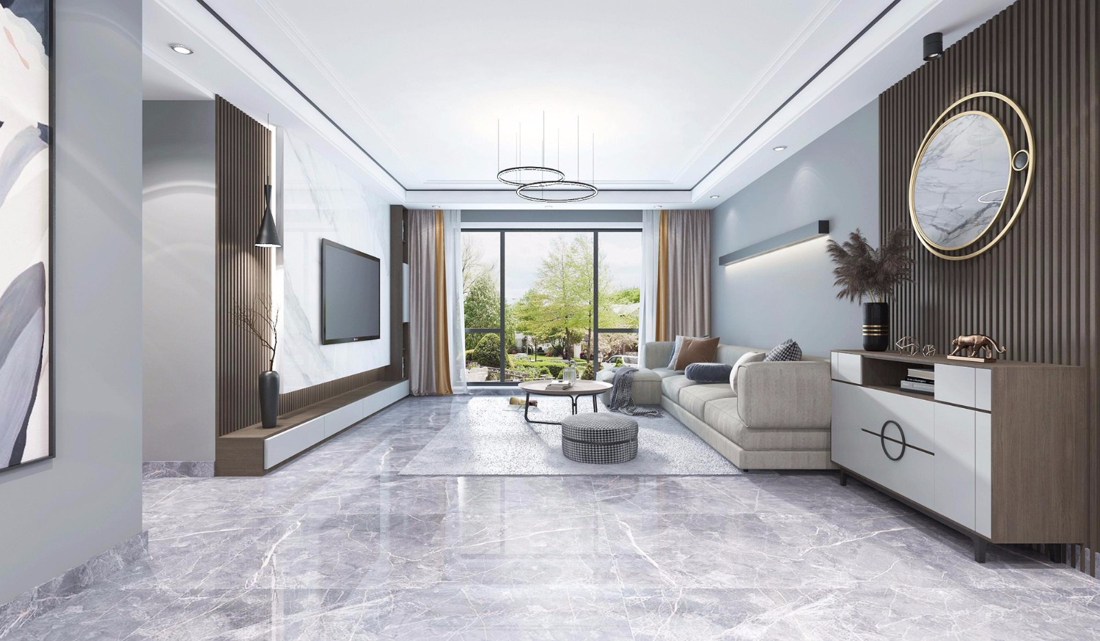 客厅:电视背景墙用格栅做为装饰,再加大理石上墙,突出效果