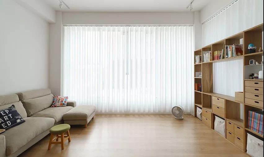 客厅本身以沙发搭配木格收纳柜,考虑到孩子还小所以放弃了安装电视,希望一家人能够更多地沟通交流,不过还是预留了电线管路方便日后改造。地板采用了无印良品色系相同板材,延伸整体视觉感受统一性。