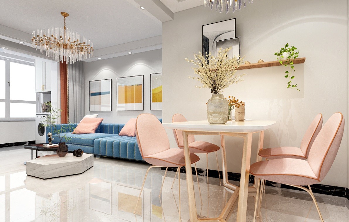 简美雾霾蓝沙发,粉红色餐桌