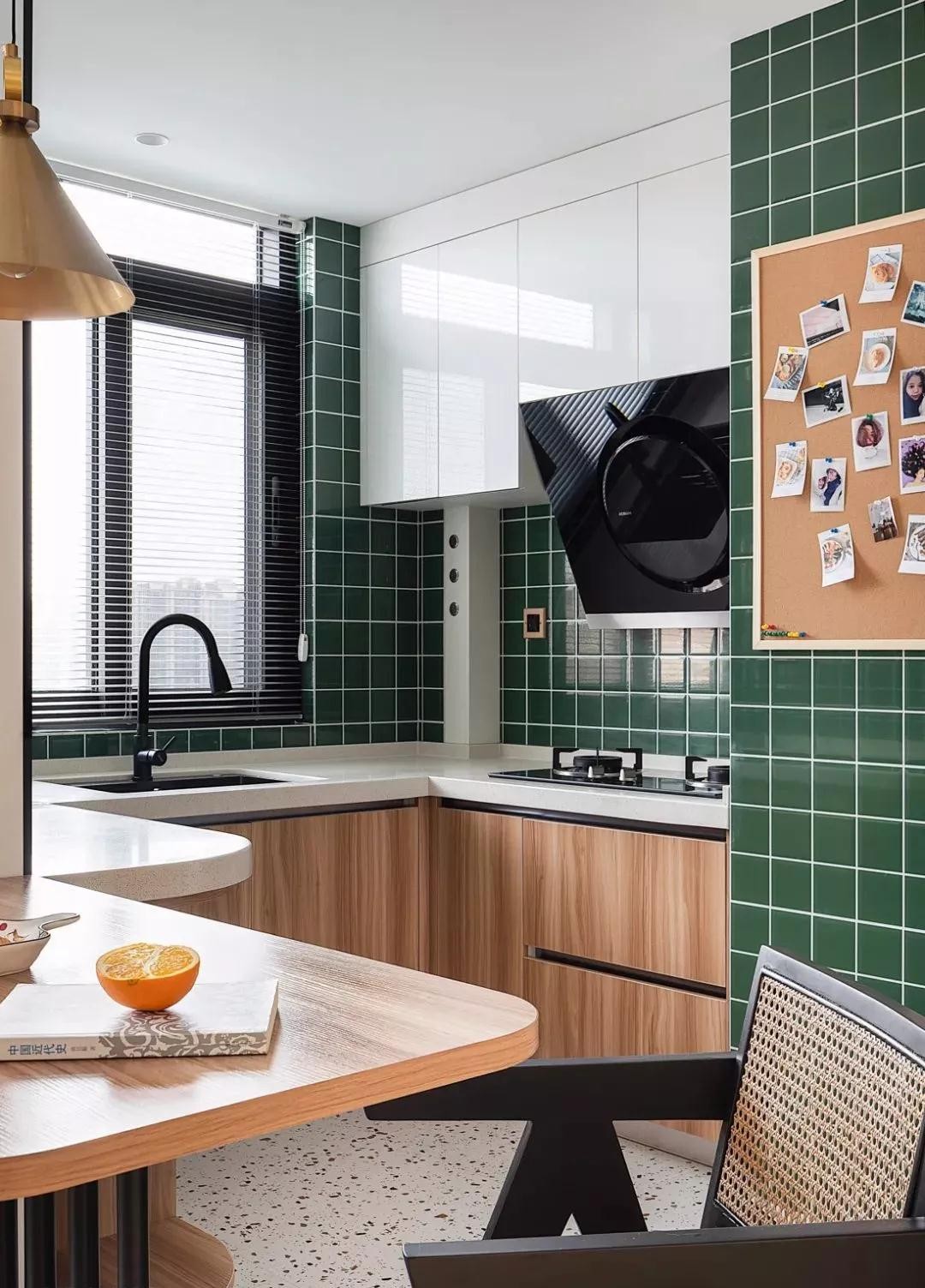 U型的厨房设计,原木的橱柜搭配绿色的墙面,清新又自然,采光也非常好。