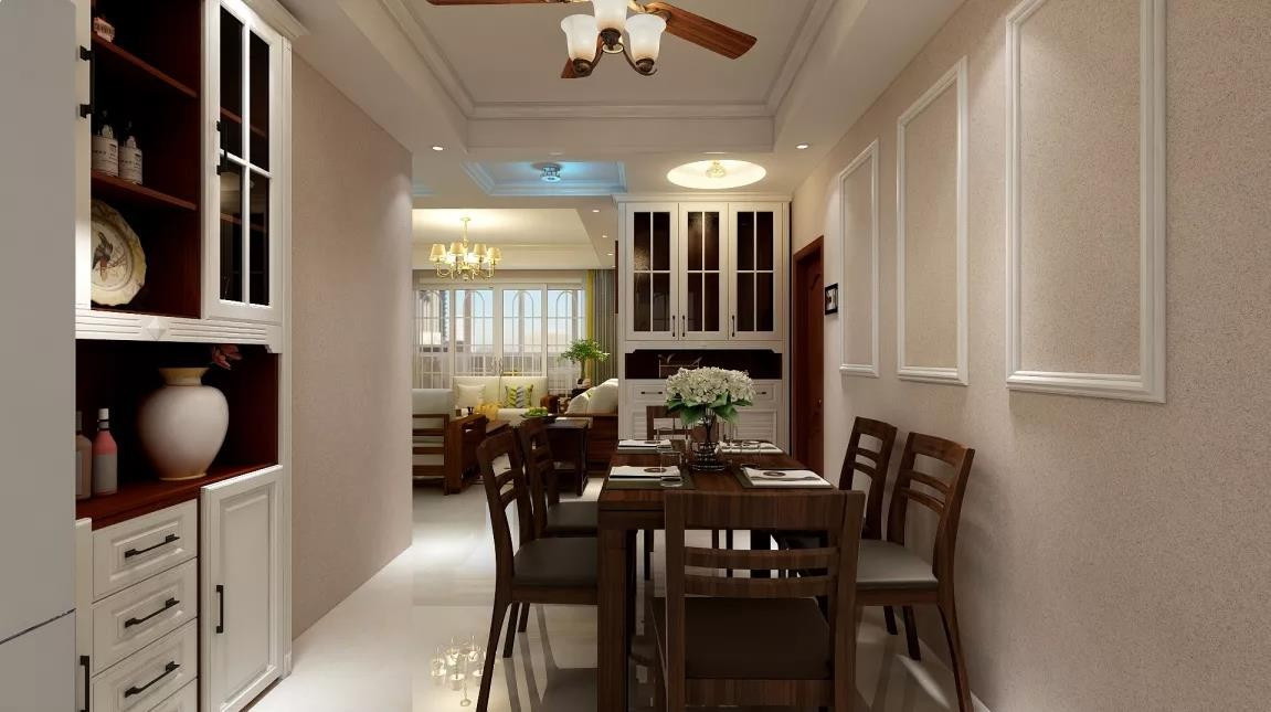 客餐厅整体色调采用浅咖色,其它的色彩主要是靠家具、窗帘、挂画这些软装部分体现,实木布艺沙发和餐桌椅、电视柜选用同一个品牌的同系列产品,自然的形成了层次,搭配美式必不可少的铁艺吊灯和大理石罗马柱电视墙。