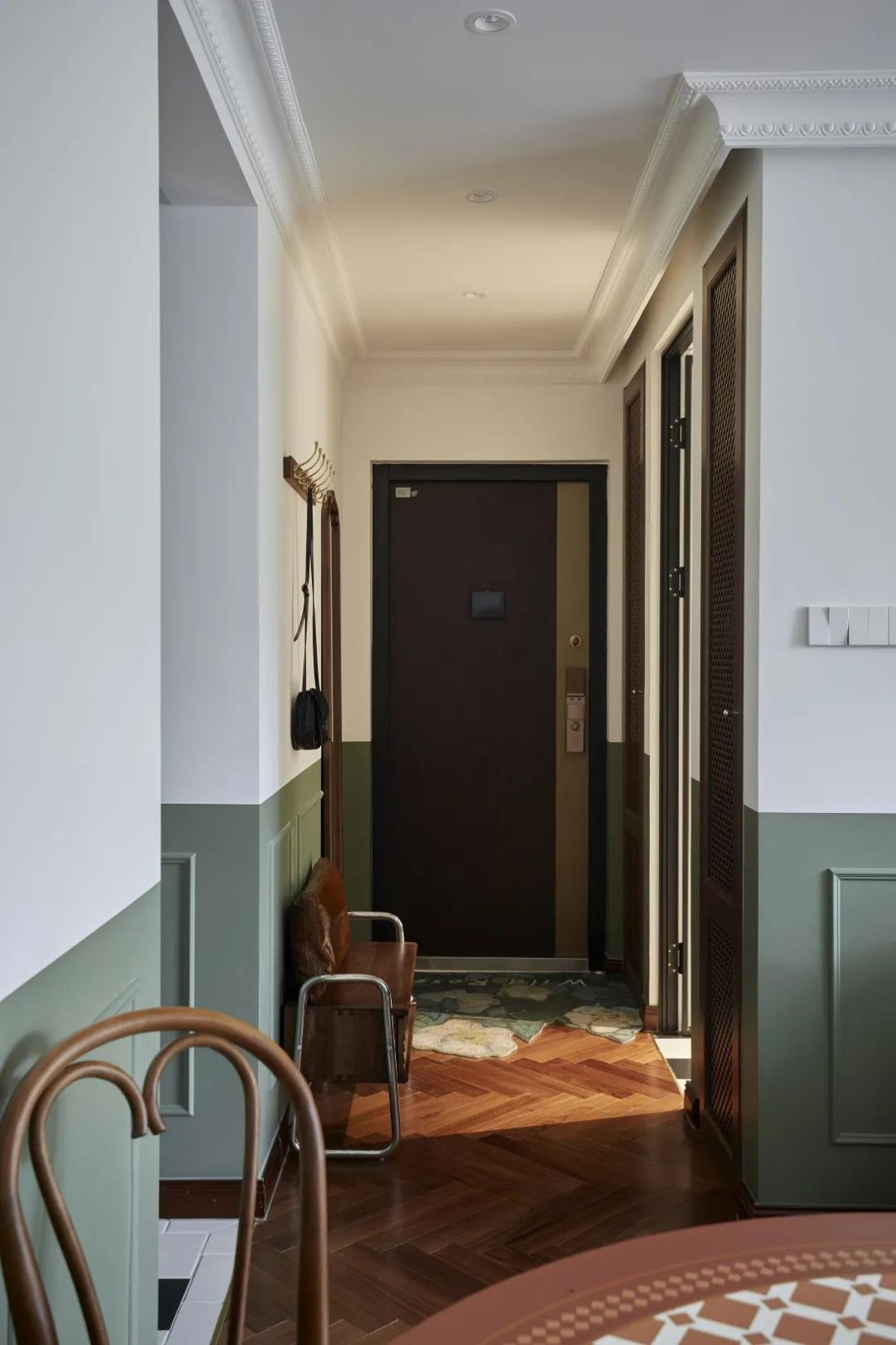关于主卧的规划,风格上与公共区域保持一致,半墙粉刷绿色乳胶漆,有效缓和了阳台梁柱的压迫。