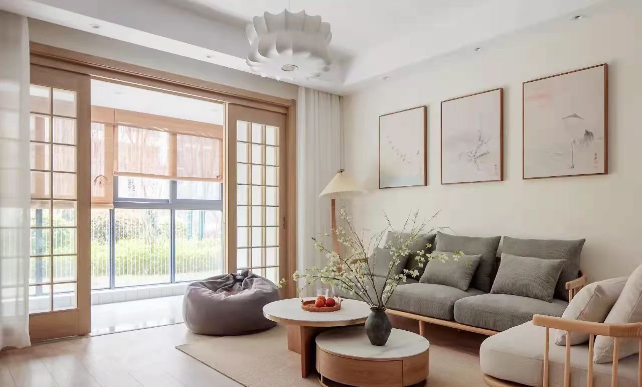 延续简约格调,木饰面与半高护墙结合浅色背景,点缀禅意挂画与百褶吊灯,温润而优雅。