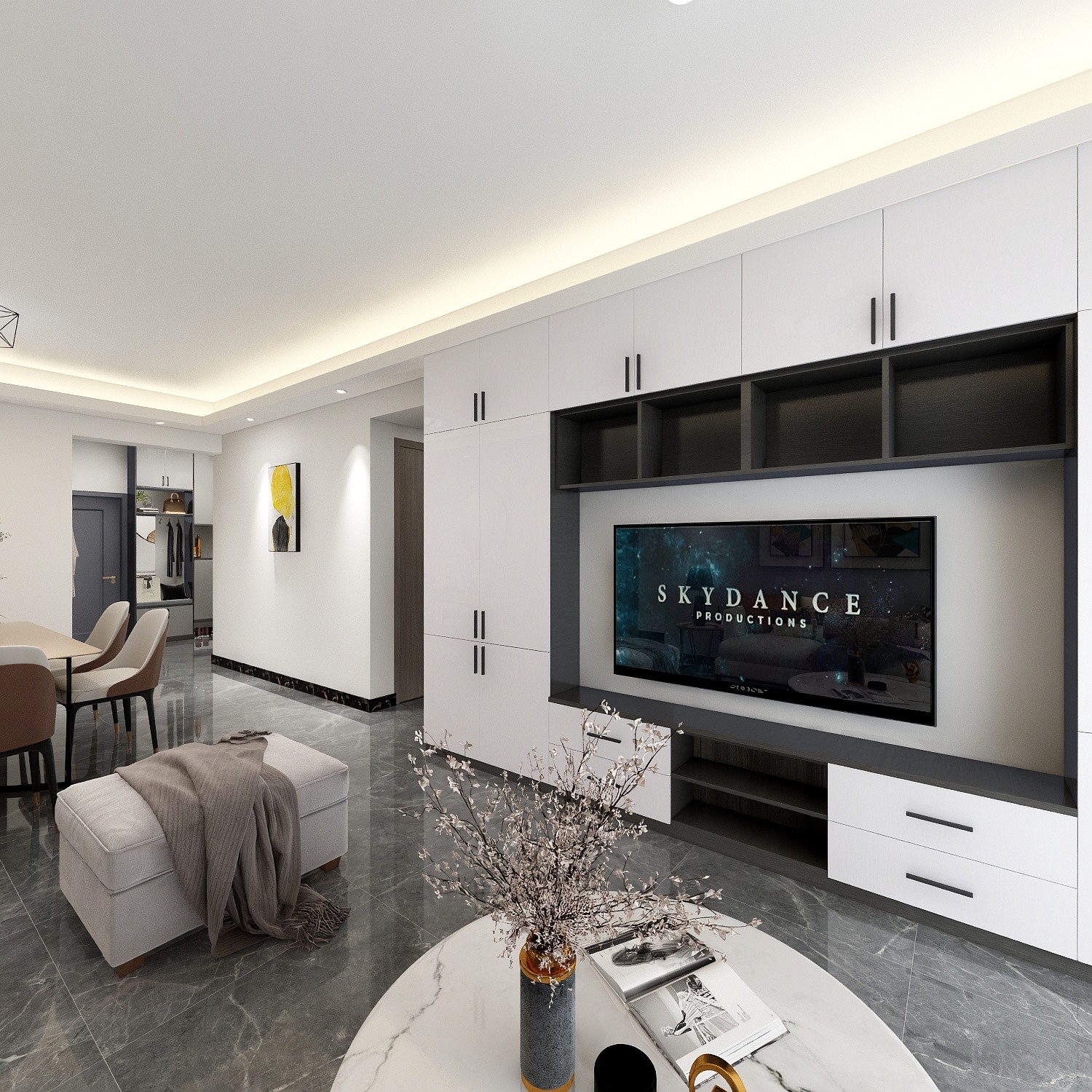 背景做满墙柜子,增加收纳空间,并且让背景墙不单调